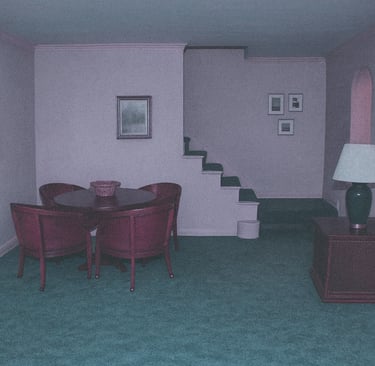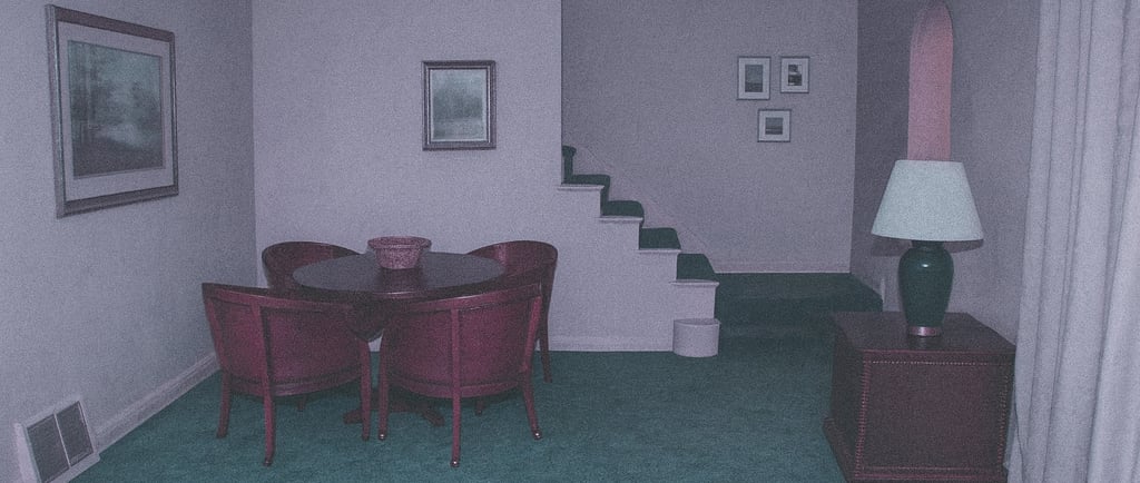 Quite awhile ago, an image started circulating again on /x/ and /b/: a dimly lit living room with teal-green carpet, muted purple walls, and a cheap dining table sitting by a half-finished staircase.